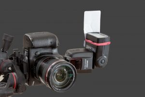 Oczywiście, gdy aparat jest w pionie, obrotową głowicę lampy można skierować w górę, ale wtedy biała karta jest skierowana w niewłaściwa stronę i oświetla ucho fotografa!