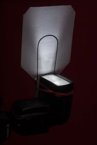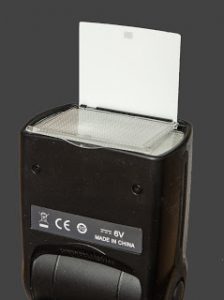 Przedmiot bez nazwy, biała plastikowa karta, wysuwana z dłuższego boku głowicy lampy błyskowej, została pomyślana jako remedium na bolączkę niekorzystnego rozkładu świateł i cieni na twarzy modela powstałych w technice bounce flash, czyli światła odbitego (zobacz poprzedni post). W założeniu, biała karta ma odbijać część światła z odchylonej głowicy lampy w kierunku modela rozświetlając cienie.
